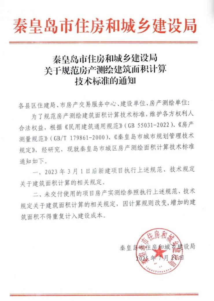 项目交付前,根据秦皇岛市住房和城乡建设局于2025年7月21日发布的《关于规范房产测绘建筑面积及计算技术标准的通知》,测绘标准有所调整,导致部分房屋实测面积较合同约定面积有所增加。