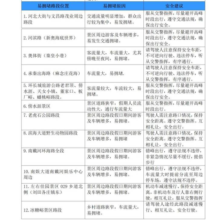 2024年国庆节将至,为保障广大群众假期出行安全,秦皇岛市公安局交通警察支队提前研判、科学分析,结合历年节假日期间交通情况,现发布2024年度国庆假期“两公布一提示”,方便广大群众合理选择出行时间、路线,尽量避开出行高峰时段和易堵路段,谨慎驾驶,安全出行。