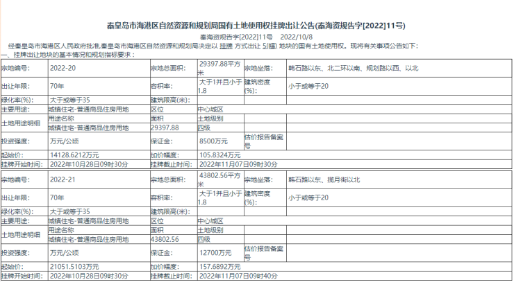 四、 本次挂牌出让的详细资料和具体要求,见挂牌出让文件。申请人可于 2022年10月17日 至 2022年11月04日 到 秦皇岛市海港区迎宾路9号秦皇岛市海港区自然资源和规划局二楼211室 获取 挂牌 出让文件。