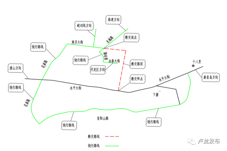 经卢龙县人民政府批准,卢龙县武山路、夷齐大街东段道路改造工程施工期间,对该路段进行断交,途径武山路、夷齐大街东段车辆需绕道行驶 。