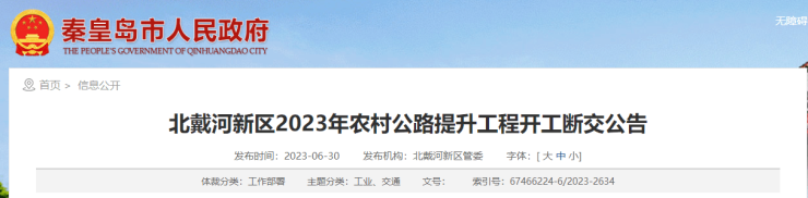 秦皇岛北戴河新区将于7月1日开始对5条农村公路进行提升改造,分别为:沿海路--枣园村段;官庄--西河南段;樵冯线--大韩庄段;黄土湾--大蒲河段;滨海新大道--沟湾段。根据工程进度,断交时间为2023年7月1日至8月31日,现通告行人和车辆进行绕行。