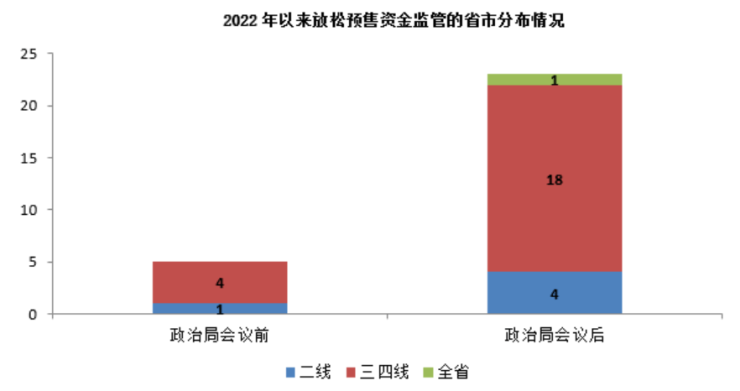 但自去年下半年以来,随着房地产市场整体持续下滑,各地也开始出现适度放宽预售资金监管的迹象,以修正此前过严的资金监管政策。尤其是今年4月29日,政治局会议提出“优化商品房预售资金监管,促进房地产市场平稳健康发展”后,各放宽预售资金监管的现象更加明显。