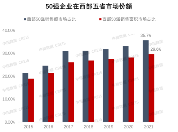 2021年,西部50强房企继续加快项目销售去化,其在西部重点五省市的房地产市场销售额份额提升至35.7%,较2020年提升2.58个百分点;销售面积同步上涨,份额占比达29.61%,较上年上涨1.47个百分点。