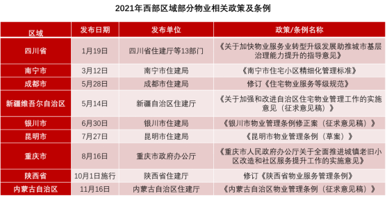 在国家层面多重政策利好的基础之上,西部地区省/直辖市/自治区层面以及地级市层面,积极响应国家指导性政策,结合各区域物业行业发展情况,出台基层社区治理、物业服务标准化、保障业主权益等多项政策与条例,为西部物业行业持续健康有序发展提供良好的外部环境。