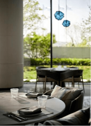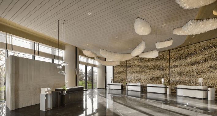 大堂内饰以温润柔和的米色和沉静深邃的蓝色为主题色,不同质感的材质搭配定制家具和几何造型灯饰,为您带来惊喜的视觉效果和引人入胜的空间享受。