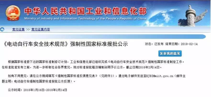 电动车新标准仍处于公示阶段,公示截止日期为2018年2月14日。
