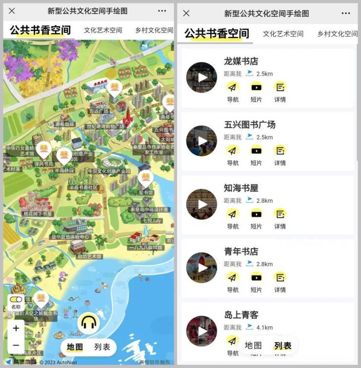 全新上线的“秦皇岛市新型公共文化空间全域电子地图”,以手绘特色为切入点,采取中国风特色,美化地图折页,从“文化艺术空间、公共书香空间、名家文化空间、乡村文化空间、数字文化空间、新型公共文化街区和新型公共文化片区”7个方面分页进行标注,实现了点击进入后对新空间的“位置导航、文字简介和视频推广”等多种功能,能点,能看,能听,能导航,让市民和游客可以方便快捷了解新型公共文化空间目的地,最大程度方便广大市民和游客快捷地享受新型公共文化服务。