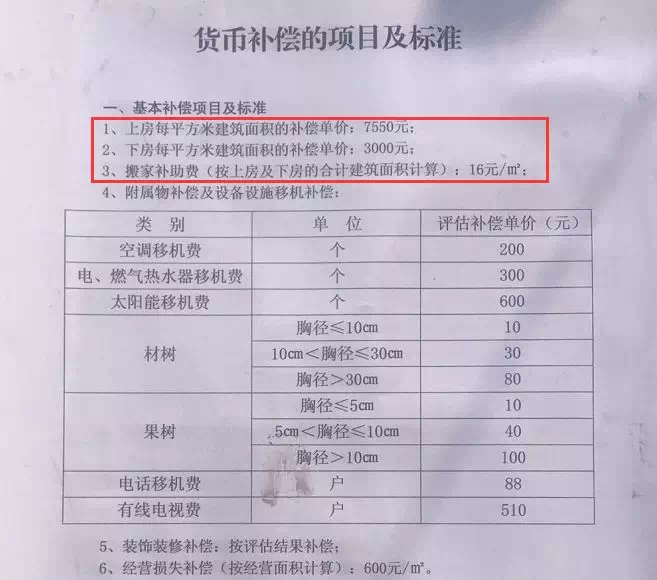 上房:有证住宅上房及已发被认定为合法建筑的住宅上房,按7550元/㎡予以补偿。