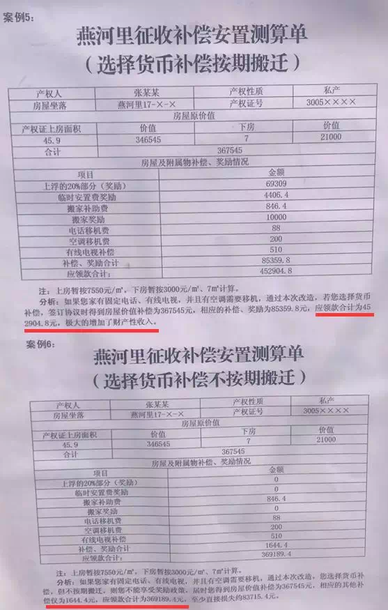 为鼓励住户按期搬迁,征收部门对选择产权调换方式的产权人分别进行了“按期搬迁”和“不按期搬迁”的补偿安置测算,通过对比案例可以看出,最终补偿所得差异巨大。