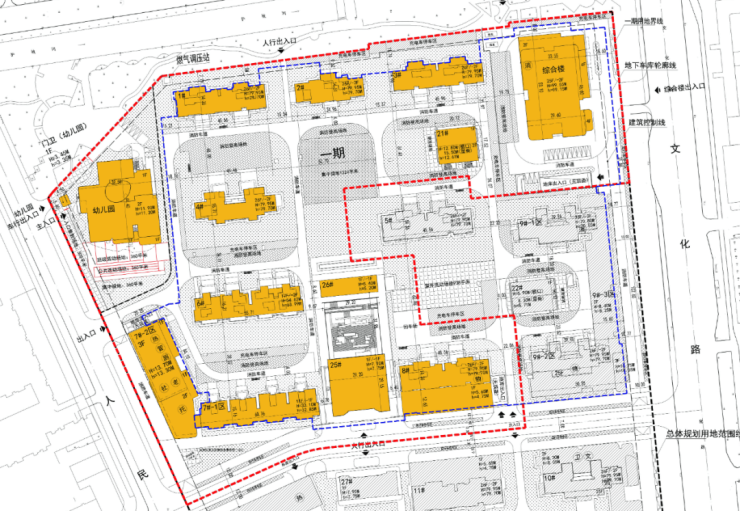 最新公示的一期地块总用地面积42952.9㎡,总建面183263㎡,一期拟建一座25层综合楼、一座幼儿园、9栋高层住宅,以及1233辆机动车停车位、1354辆非机动车停车位。一期拟建建筑如下: