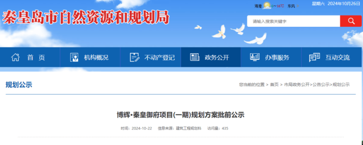 此次公示的博辉·秦皇御府项目是由博辉地产旗下的秦皇岛市博裕房地产开发有限公司于2023年12月26日成功竞拍的一宗商住用地,宗地编号:2023-06,拿地总价106289.9万元,起始楼面价:4270元/㎡。