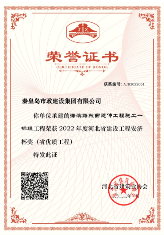 近日,河北省建筑业协会公布2022年度河北省建设工程安济杯奖(省优质工程)获奖工程名单,我公司承建的海滨路东西延伸工程施工一标段工程荣获2022年度河北省建设工程安济杯奖(省优质工程)。