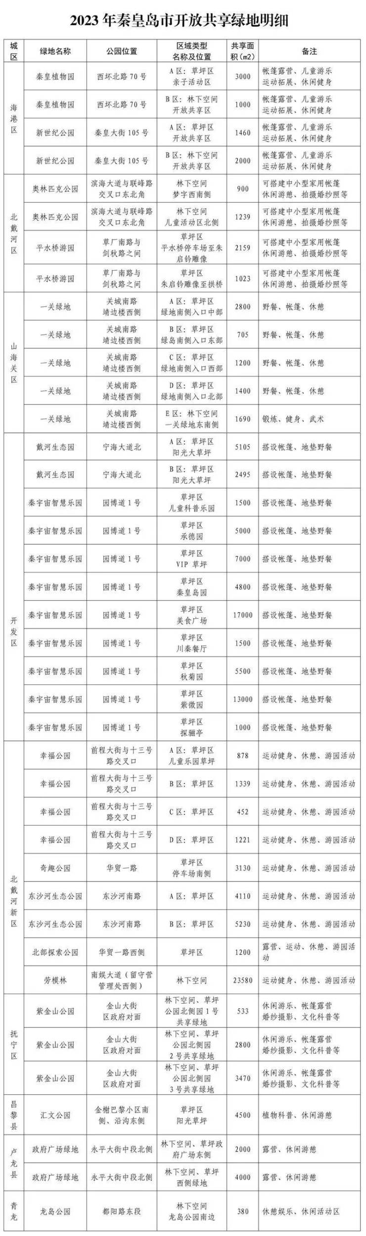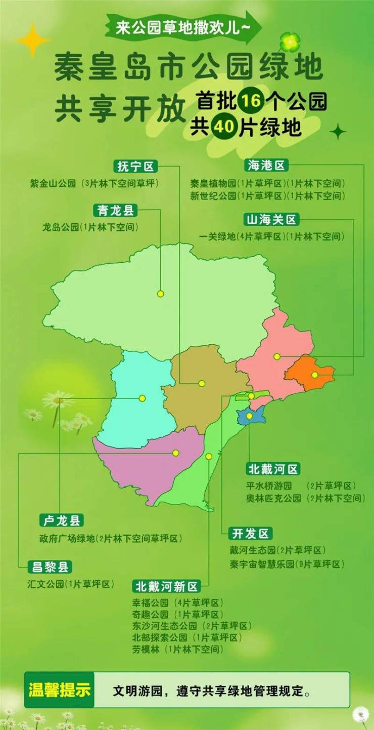 我市首批开放共40块绿地:其中海港区4处、山海关区5处、北戴河区4处、开发区11处、抚宁区3处、北戴河新区9处、昌黎县1处、卢龙县2处,青龙满族自治县1处。共享绿地融入家庭露营、亲子乐园、运动健身等元素,开展休闲游憩、搭设帐篷等多样化活动类型,满足“全龄段”需求,全力打造市民亲近自然、休闲游憩的优美绿色空间,让更多的市民对城市绿地可感、可享。