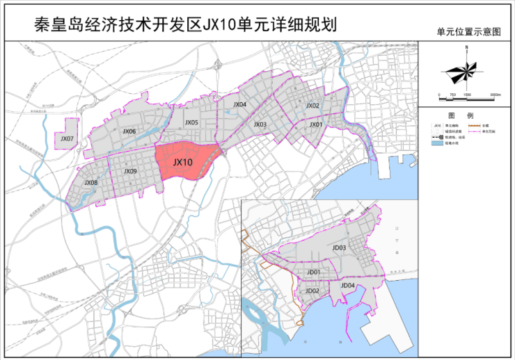 秦皇岛经济技术开发区JX10单元, 东至兴凯湖路,西至栖云山路,南至宁海大道,北至津山铁路 ,单元面积 576.64公顷 ,主导功能为以生态、文旅、宜居为主的秦皇岛现代城市绿色综合体。
