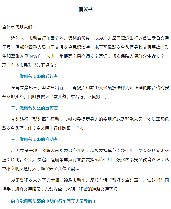 秦皇岛市公安局交通警察支队骑乘电动自行车佩戴安全头盔倡议书。来源:秦皇岛交警…