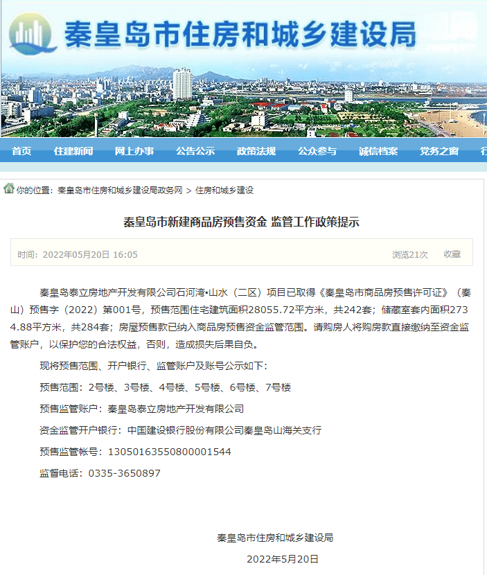 预售监管账户:秦皇岛泰立房地产开发有限公司