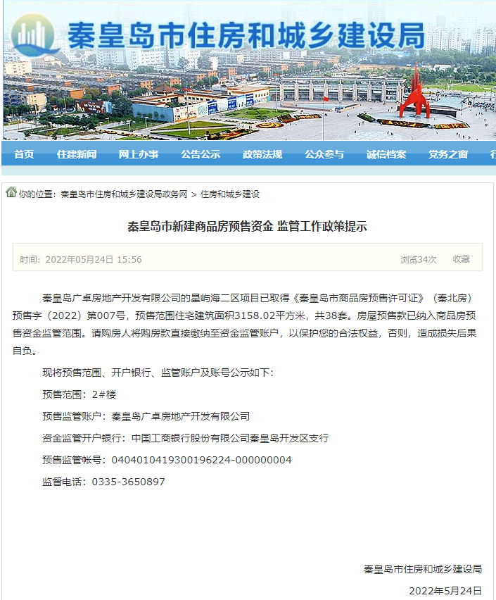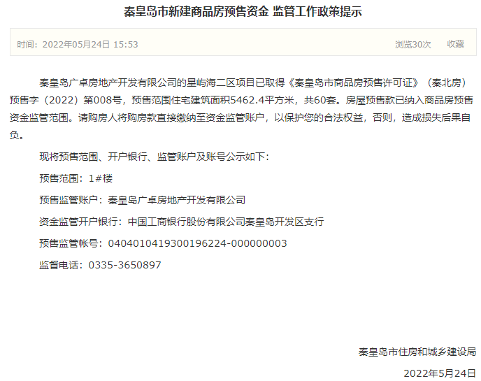 预售监管账户:秦皇岛广卓房地产开发有限公司
