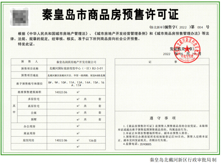 预售证号:(秦北房)预售字(2 02 2)第00 7号