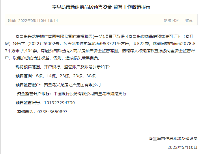 预售监管账户:秦皇岛兴龙房地产集团有限公司