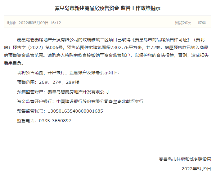 预售监管账户:秦皇岛碧秦房地产开发有限公司