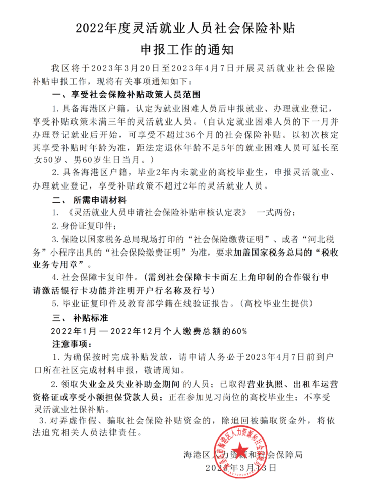 海港区人力资源和社会保障局发布关于2022年度灵活就业人员社会保险补贴申报工作的通知↓↓↓