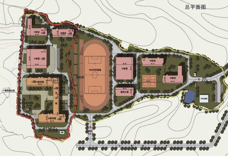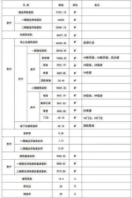 其中,一期建筑面积28325. 29平方米,包括教学楼、宿舍、食堂、消防泵房;二期建筑面积18001. 26平方米,包括宿舍、教师公寓、食堂、门卫。