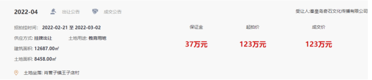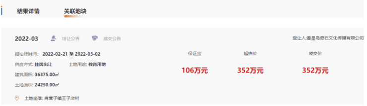 据了解,该学校项目用地为今年3月2日,由秦皇岛奇石文化传播有限公司以总价475万元成功获拍的2022-03、2022-04号教育用地,位于肖营子镇王子店村,土地面积总计为32708㎡。