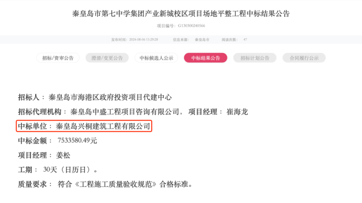 兴桐建筑中标秦皇岛市七中集团产业新城校区工程