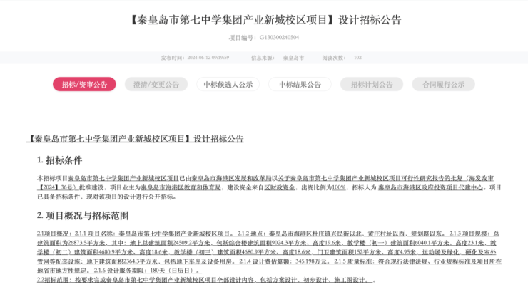 此前,秦皇岛市第七中学集团产业新城校区项目还曾发布过设计招标公告,公告信息如下