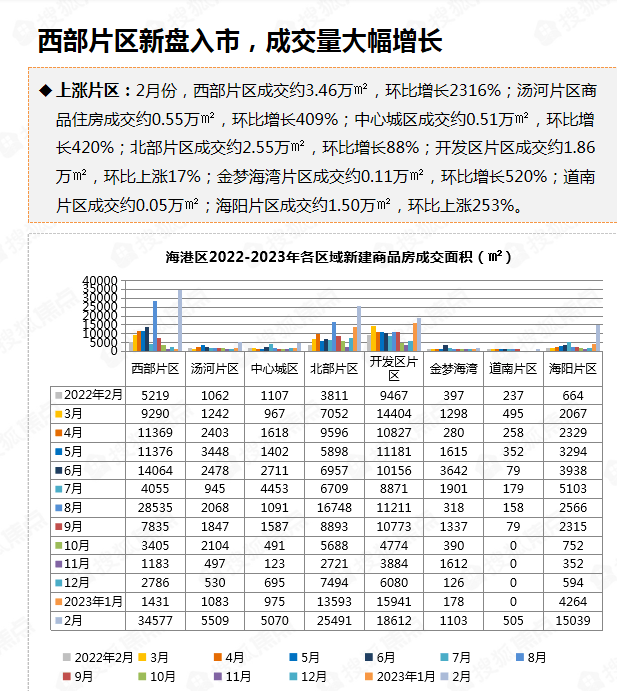 其中海港区2月新房成交面积共计约105906㎡,环比上浮182.68%。