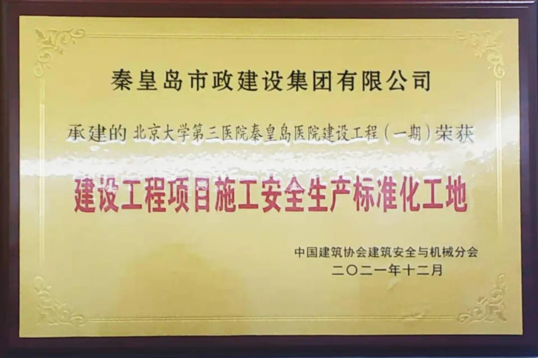 ▲2021年12月,中国建筑协会建筑安全与机械分会授予秦皇岛市政建设集团有限公司承建的北京大学第三医院秦皇岛医院建设工程(一期)“建设工程项目施工安全生产标准化工地”荣誉。