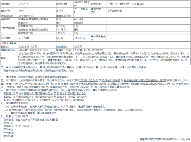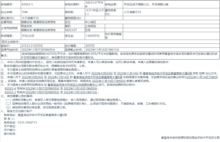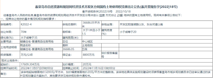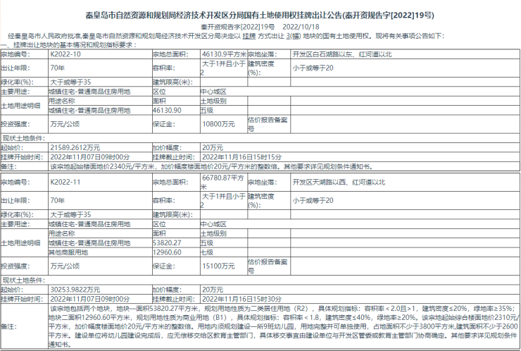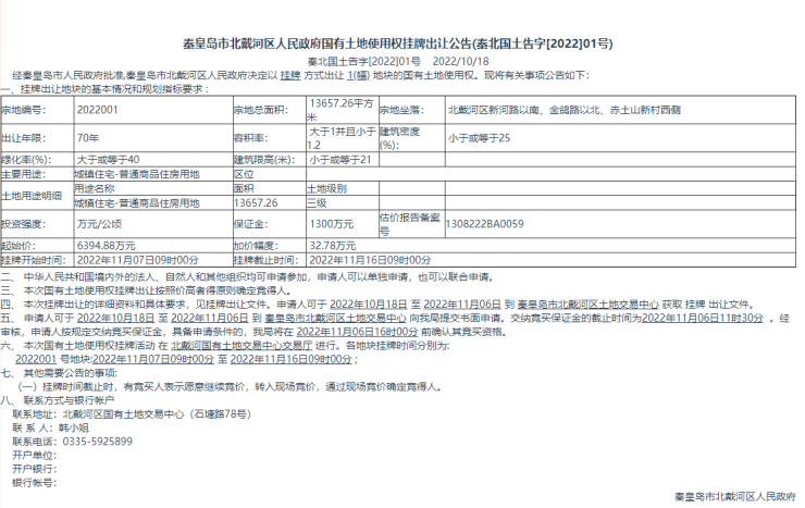 近日,中国土地市场网公布了即将出让的6宗住宅用地,总面积达27.12万平米,涉及金额12.56亿元。1宗位于北戴河区,5宗位于开发区。来源:中国土地市场网…