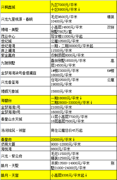房价下降的楼盘主要集中在海港区,既有兴桐鑫城和皓月天誉等刚需楼盘,也有海碧台和秦皇府等改善项目。