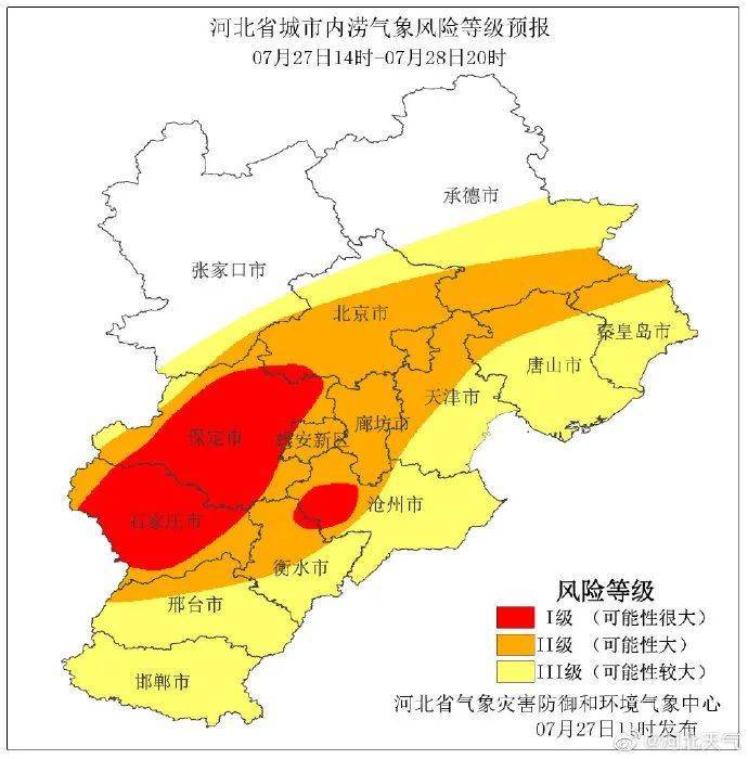 据河北省气象局预测,7月27日下午至28日夜间,承德南部、唐山北部、秦皇岛北部、廊坊、保定、雄安新区、石家庄、沧州西部、衡水、邢台中西部、邯郸有暴雨(50-90mm),其中保定、石家庄、沧州西部、衡水西部局地有大暴雨(100-150mm),个别地点雨量可达200mm。经会商研判,依据《河北省防汛抗旱防台风应急预案》,河北省防汛抗旱指挥部决定于7月27日14时启动防汛Ⅳ级应急响应。