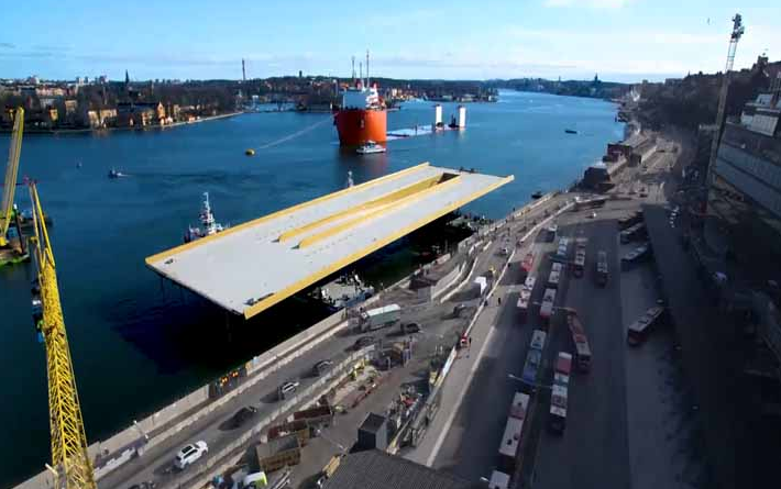 Slussen大桥是桥隧结合的变截面钢箱梁巨型桥梁,对材料和工艺的要求很高,在桥面中间位置设置了一条下穿线路,桥身长140米、宽45米、中心部分较大跨度58米。大桥有3条行车道,重3400吨,设计桥龄为120年。