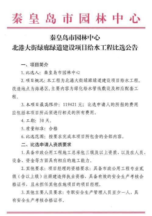 近日,秦皇岛市园林中心发布北港大街绿廊绿道建设项目给水工程比选公告,该项目曾在今年4月份进行施工招标,详情如下: