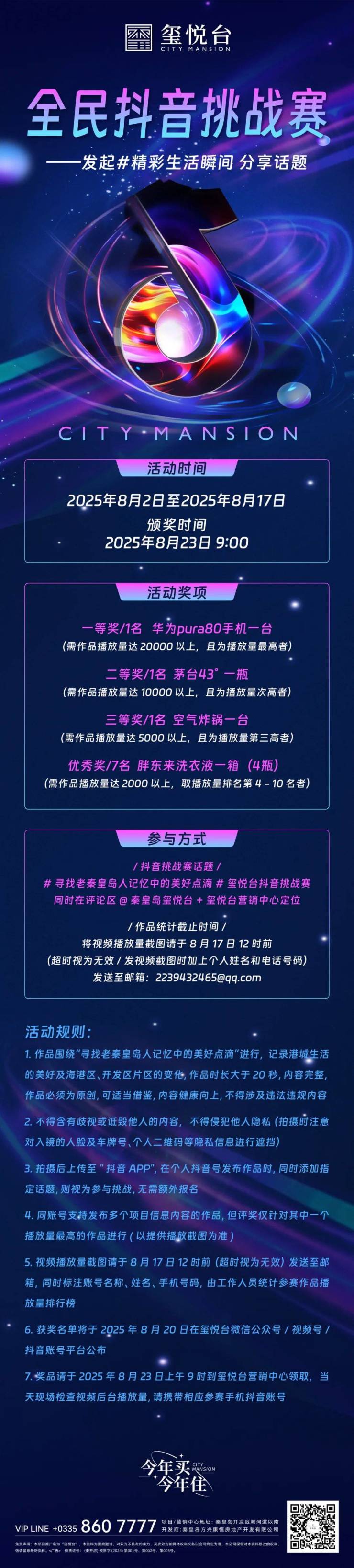 ”玺悦台杯“全民抖音挑战赛温情启幕!@所有老秦皇岛人,那些藏在时光里的城市记忆 —— 是西沙滩的老冰棍甜,是老火车站的汽笛声远,是街巷里弄的邻里家常,或是某棵老树见证的岁月变迁…… 用镜头拾起这些美好点滴,分享你与港城的独家故事,就有机会赢取华为手机,让珍贵回忆不止留在心底,更能收获惊喜好礼!