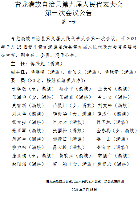 卢龙县第十七届人民代表大会排名前列次会议于2021年7月15日选举出卢龙县第十七届人民代表大会常务委员会主任、副主任和委员,名单如下:主 任:程 浩副主任:韩淑敏(女) 孟祥春 李继华 张 伟委 员:(按姓名笔画排序)马立晶、王志刚、王怀荣(女)、王杰(女)、王昆、白晓红(女)、朱云生、刘泽、齐春宝、闫志、李志佳、李利金、李娟(女)、 李强、杨国富、吴铁军、邸亚林、张少祥、陈汝新、陈秀艳(女)、苑坤、赵洋、胡刚、滑军为。现予公告 卢龙县第十七届人民代表大会排名前列次会议主席团二〇二一年七月十五日