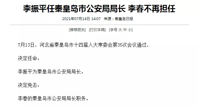 李振平任秦皇岛市公安局长