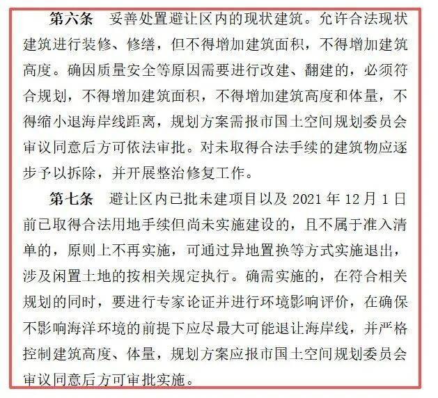在管控要求上,《规定》实行“准入清单+分类管控”。避让区内原则上禁止或限制建设,仅允许国家省重大项目、军事设施、必要公共配套和基础设施、生态修复工程等九类项目进入,且须经严格审批,严控规模与布局,最大限度减少对海岸生态的干扰。对现有合法建筑,允许修缮但不予增建、扩容。