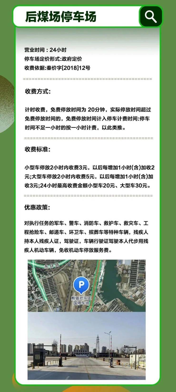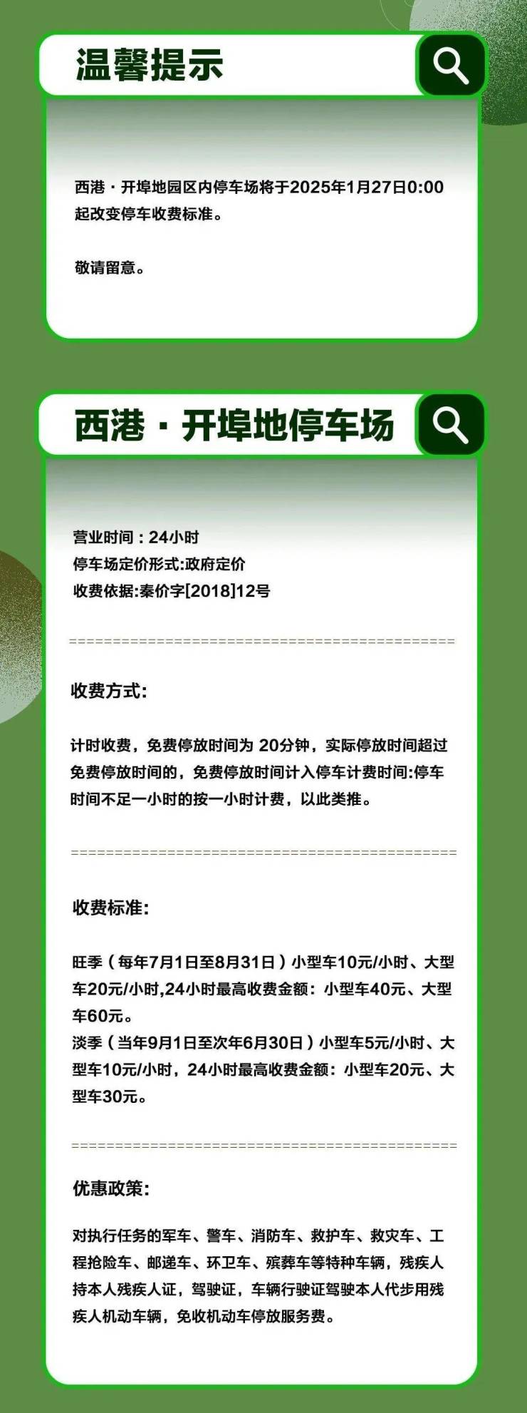 今年1月27日起,西港开埠地园区内停车场收费规则将进行调整;东港路后煤场(熊猫欢乐王国附近)停车场开启收费,具体调整内容和收费标准见图。