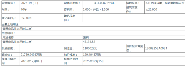 • 2025-19(2)地块:面积43134.82平方米,容积率1.0至1.5之间,起始价21739.9493万元,保证金1.1亿元。