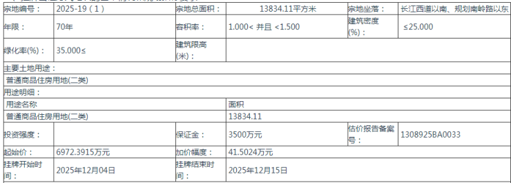 • 2025-19(1)地块:面积13834.11平方米,容积率1.0至1.5之间,起始价6972.3915万元,保证金3500万元。