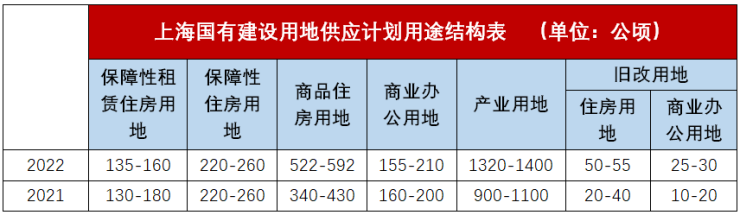《供应计划》显示,2022年上海计划供应土地面积2427-2707公顷,比20221年计划供应面积1920-2420公顷总供应量增长明显。其中计划供应商品住房用地522-592公顷,同比增幅达44.7%。