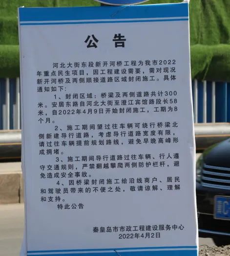 河北大街东段新开河桥工程为我市2022年重点民生项目,因工程建设需要,需对现况新开河桥及两侧顺接道路区域封闭施工。具体通知如下: