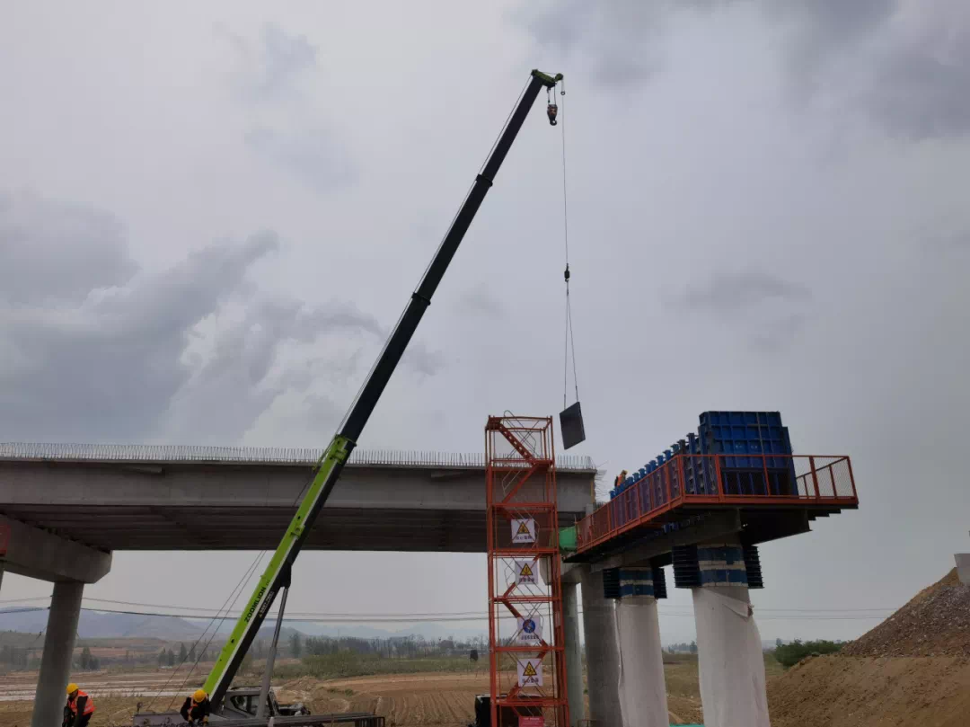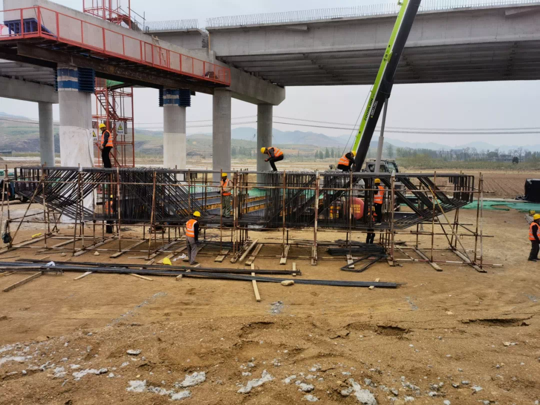 在中交一航局承建的B6标段大新寨大桥施工现场,忙碌而有序,工人们正在绑扎盖梁钢筋,绑扎完成后将会整体吊装至桥上进行后续的合膜、打灰等程序。