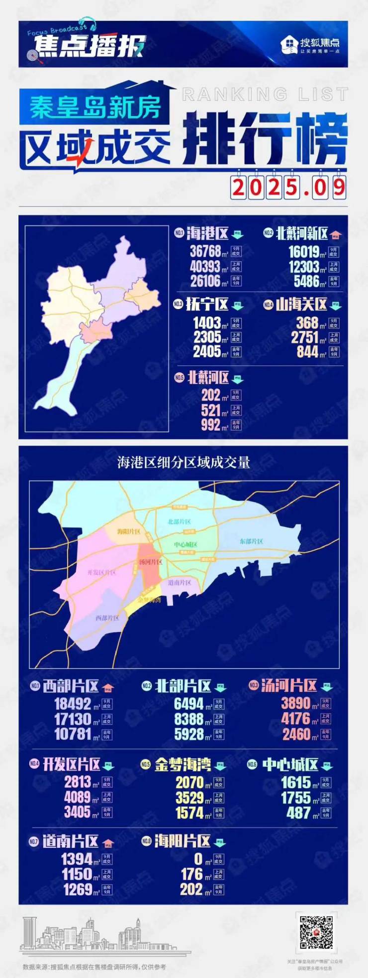 9月份,秦皇岛房地产市场5大区域(含北戴河新区)新房成交面积,仅北戴河新区成交量环比上涨,海港区、北戴河区、抚宁区、山海关区成交量环比下跌。