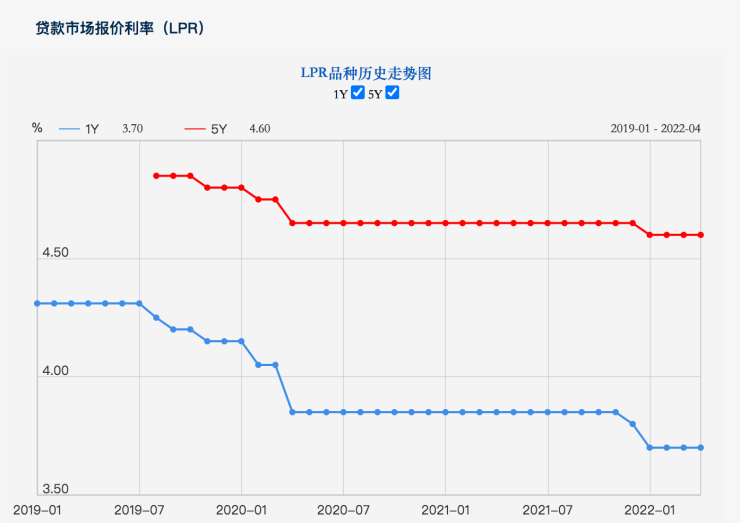 今年4月20日,中国人民银行授权全国银行间同业拆借中心公布,2022年4月20日贷款市场报价利率(LPR)为:1年期LPR为3.7%,5年期以上LPR为4.6%,连续三个月不变。作为房贷报价的参考基准,对房地产市场而言,更能反映按揭贷款利率走向的是5年期以上LPR。