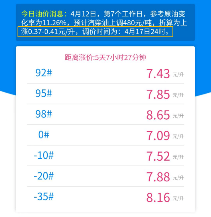 4月10日,第5个工作日,参考原油变化率为11.02%,预计汽柴油上调470元/吨,折算为上涨0.36-0.40元/升,调价时间为:4月17日24时。