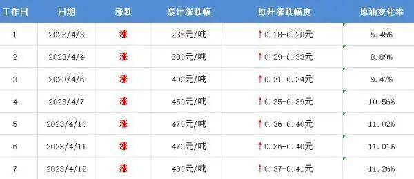 本轮油价周期统计已过半数,4月10日,较前一个工作日再涨20元/吨,预计汽柴油上调高470元/吨,直逼500元大关。经过多天连续上涨后,最终突破了4毛每升,将刷新今年来最大涨幅。